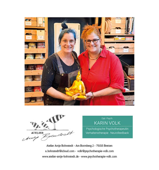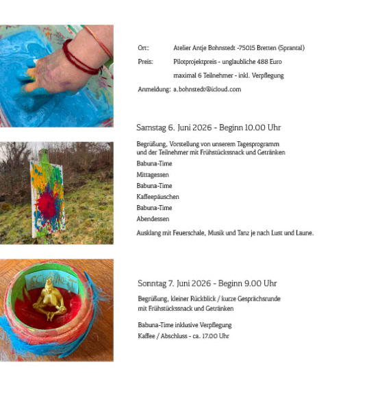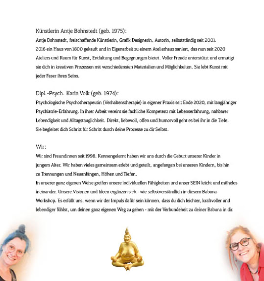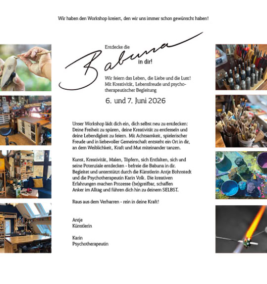Kunst, Kreativität, Malen, Töpfern, sich Entfalten, sich und seine Potenziale entdecken - befreie die Babuna in dir. Begleitet und unterstützt durch die Künstlerin Antje Bohnstedt und die Psychotherapeutin Karin Volk. Die kreativen Erfahrungen machen Prozesse (be)greifbar, schaffen Anker im Alltag und führen dich hin zu deinem SELBST.